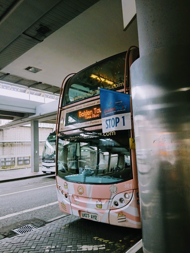 The first challenge was to find the bus and, when we did, the location was far from whimsical. We had got the tube to Victoria so we walked through the station, up the escalators into the Mall and then out the other side. The bus stop was pretty much just over the road from that back entrance of the station but it was a giant dark garage really.