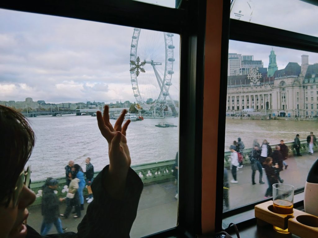 The route took us past St James Park tube, around Parliament Square and across Westminster Bridge before going behind County Hall and all the way along the South Bank to London Bridge. Look, here’s VK waving to her father’s office even though her father was working from our lounge in Highams Park. I have a feeling that we were doing the route in reverse, based on the map on the website and the fact that we saw another Afternoon Tea bus passing us in the opposite direction. It also explains why the commentary – which only came on intermittently – said we were entering the City of London when we were leaving it and approaching Trafalgar Square when we’d just been around it. But I’m sure no one else was keeping tabs on these things. Most of the time, the bus was just playing feelgood party tunes (ABBA, Shania Twain, Bon Jovi) so we sang along to those rather than wondering who designed St Paul’s Cathedral.