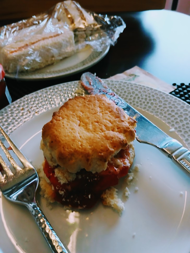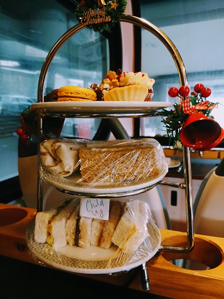 We did ask for vegetarian sandwiches for VK, which were provided and largely ignored. Inevitable when there’s more exciting fare on offer. On her plate, there was a jam sandwich, one with chocolate spread, a cheese sandwich and a cucumber sandwich. I took her cheese and had it along with a cheese and ham sandwich (I’ve been cheese deprived for a long time, OK??) and a chicken caesar wrap. The egg and salmon sandwiches sadly did not fulfil their destiny.