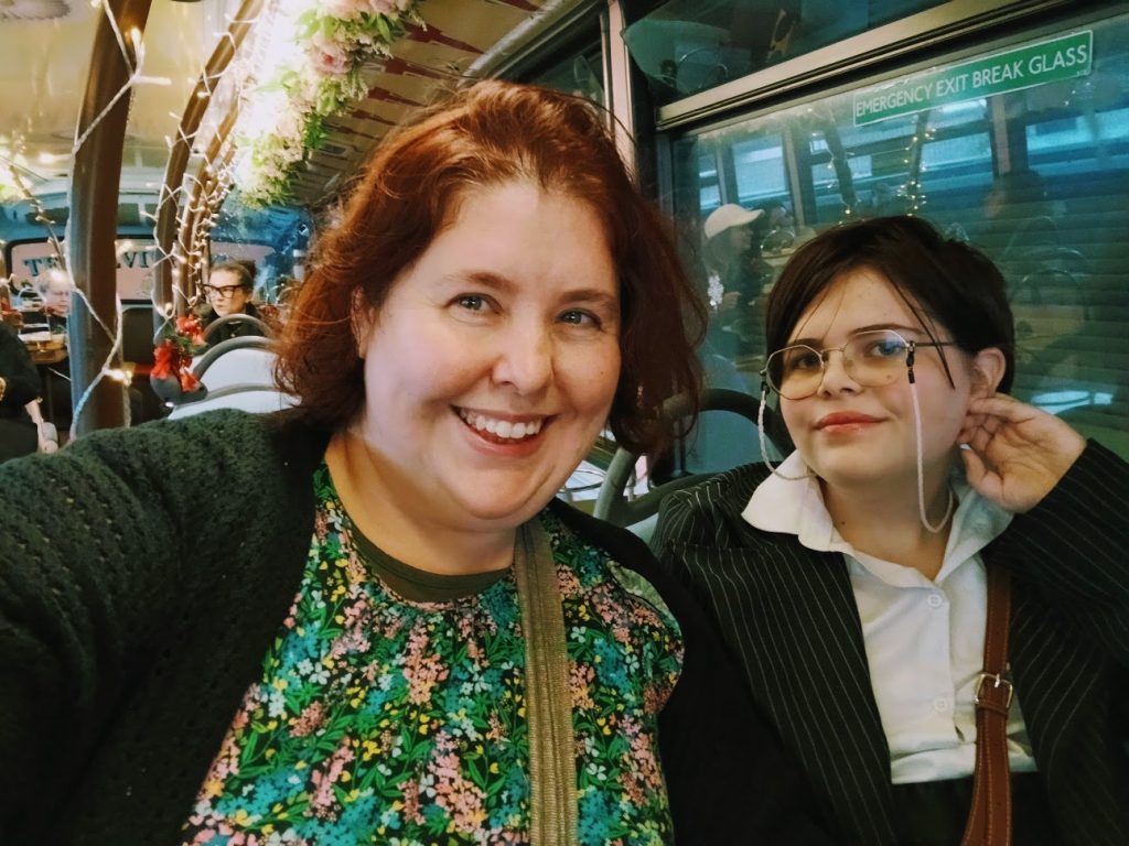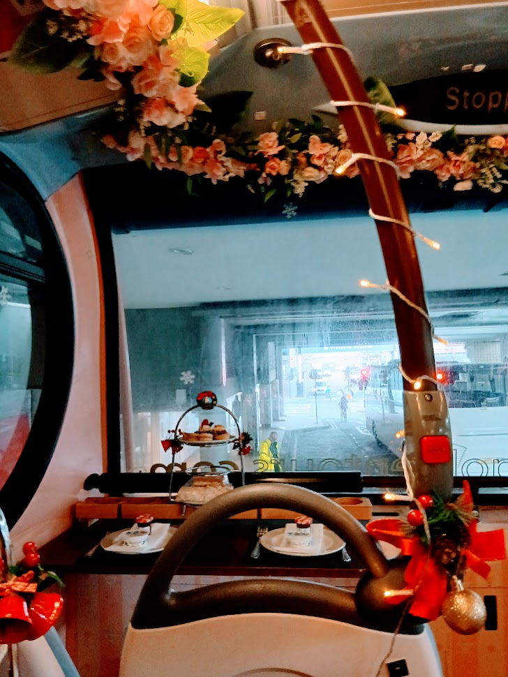 The bus itself was pretty though! And we were let onboard very quickly, to sit amid the flowers and fake ceiling roses for our tea. We’d booked the lower deck but got a free upgrade to the top deck, which was where most of the other parties were seated too.